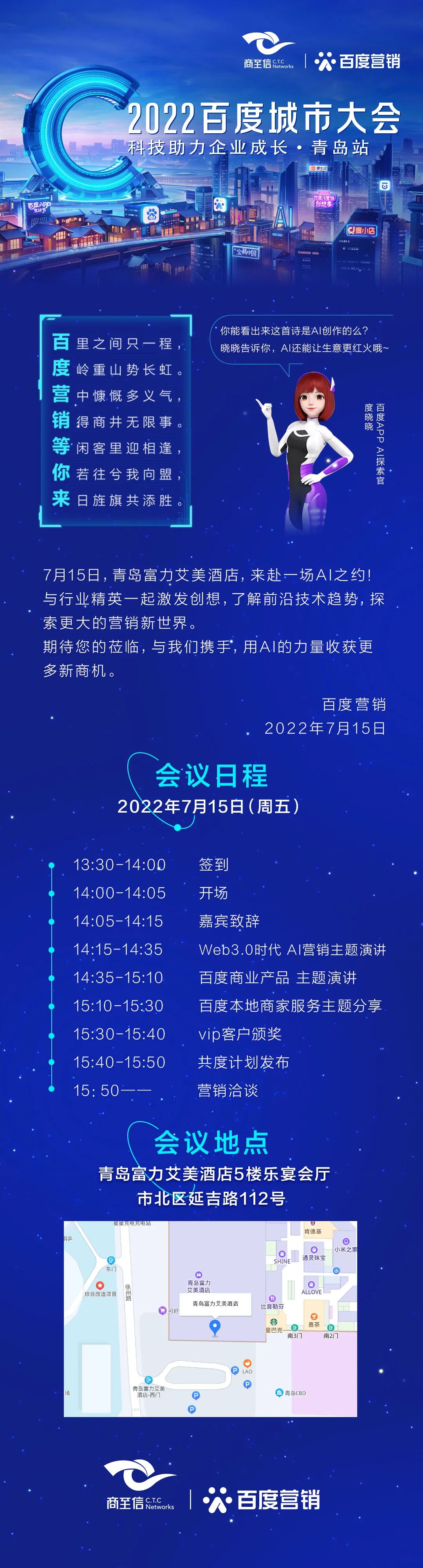 7月15日,百度攜手商至信集團開展的2022百度城市大會·青島站暨科技助力企業(yè)成長將于下午1:30在青島市延吉路112號富力艾美酒店召開。本次大會旨在通過互聯(lián)網手段助力青島地區(qū)企業(yè)崛起。